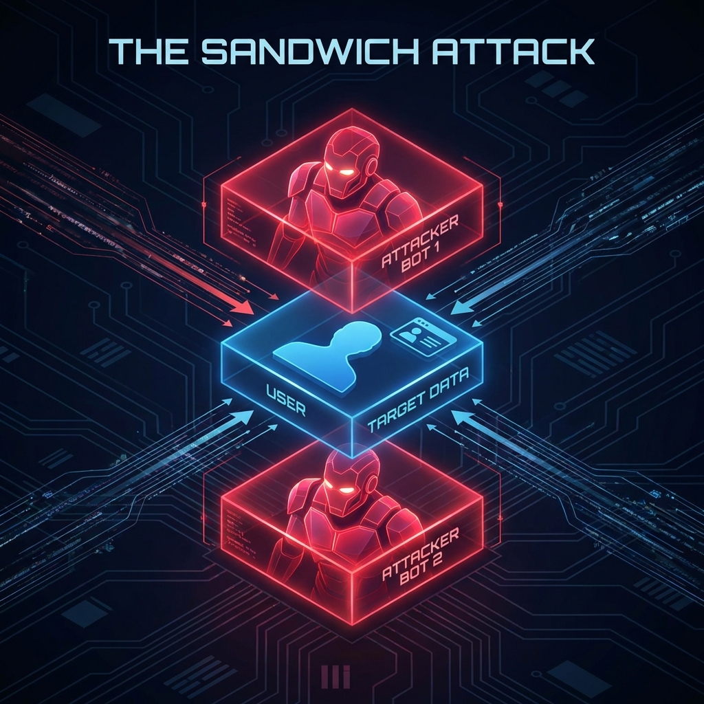 Köt egy üzletet 10 ETH-ért. A csúszási tolerancia (slippage) 1%-ra van állítva. Pontosan -0,99%-on teljesül. Balszerencse? Nem. "Szendvicsbe" fogták. Egy MEV bot látta a tranzakcióját a mempoolban, magasabb gázdíjat fizetett, hogy Ön előtt vásároljon, és azonnal eladott, miután Ön felhajtotta az árat. Ez az adó évente milliárdokba kerül a kereskedőknek.